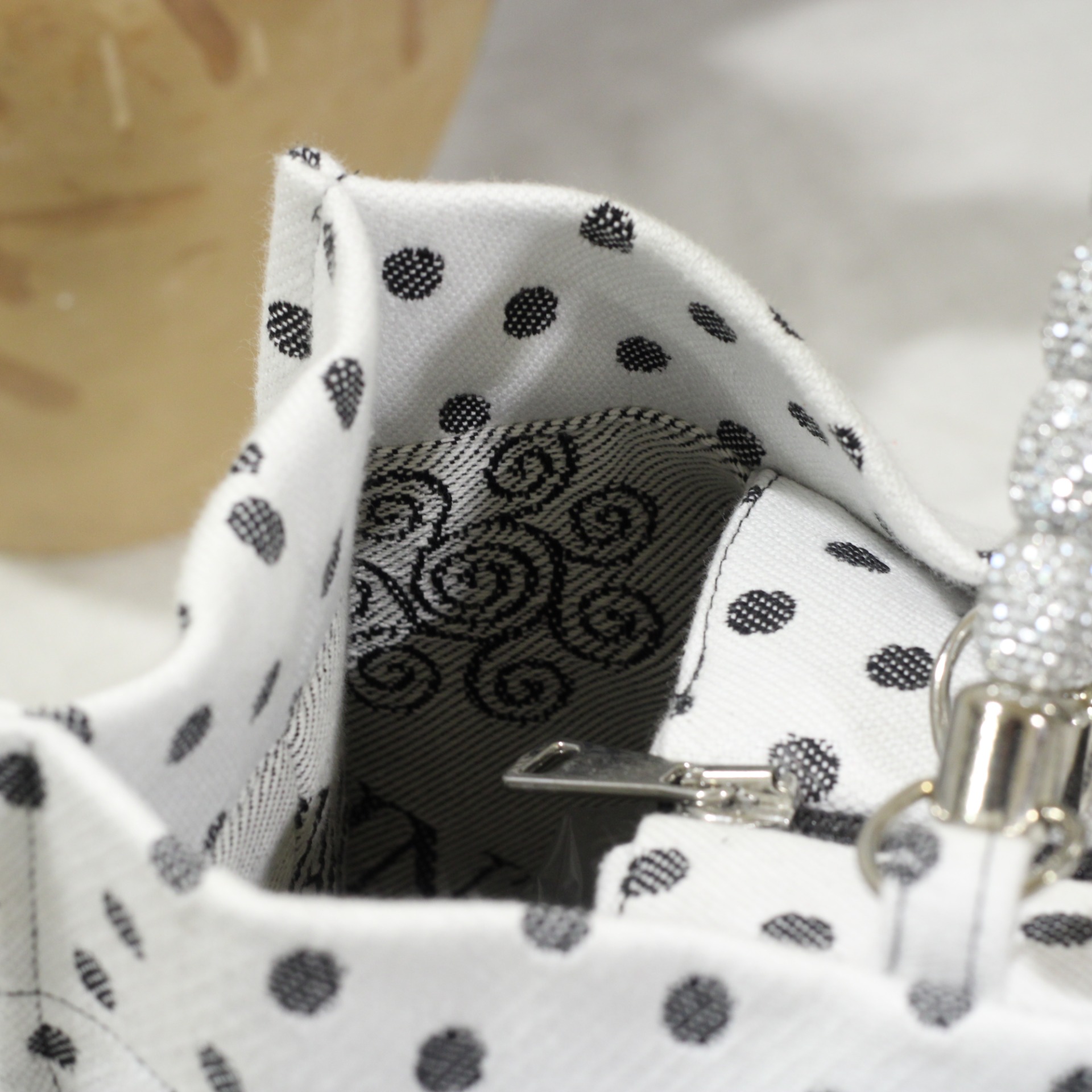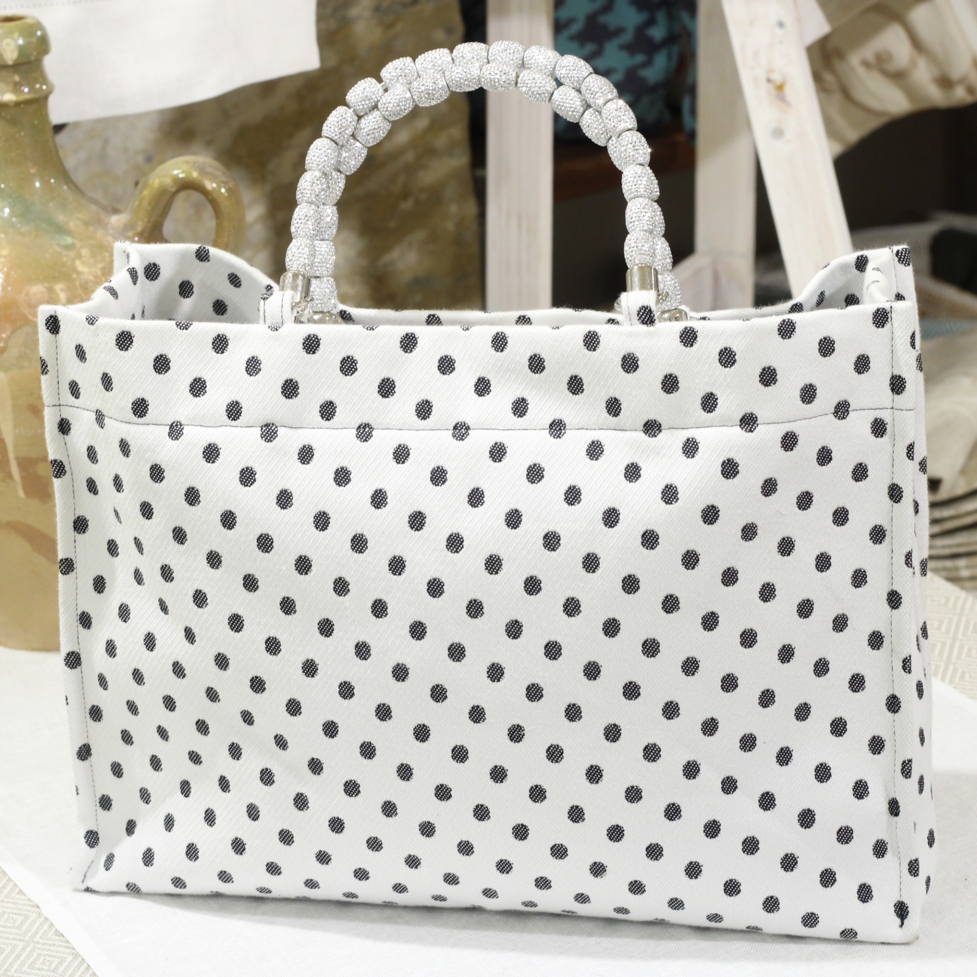 Il tessuto, realizzato in misto lino, è caratterizzato da un disegno a pois neri su fondo bianco, essenziale e grafico, che rievoca la luce del Mediterraneo e l'eleganza senza tempo dei motivi classici.